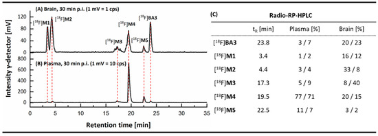 (A,B) Representative radio-RP-HPLC chromatograms of in vivo metabolism studies from brain and plasma samples obtained 30 min p.i. of [18F]BA3 in a CD-1 mouse ([18F]M1-[18F]M5: radiometabolites detected in brain; gamma-detection via radio-RP-HPLC: ReproSil-Pur 120 C18-AQ column (250 × 4.6 mm, 5 µm), Gradient MeCN/20 mM NH4OAcaq. (see quality control), flow: 1 mL/min) and (C) the amount of radiometabolites in percent (n = 2).