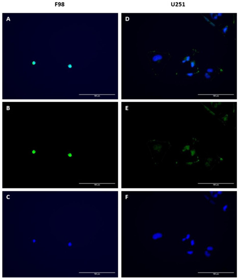 Immunofluorescent staining of HDAC1 enzyme. Representative images of the HDAC1 staining in (A–C) F98 cells and (D–F) U251 cells. (A,D) pictures displays the merged channels, (B,E) the green channel only and (C,F) the blue channel only. (Scale bar: 100 μm, magnification ×40, green channel: HDAC1 staining, blue channel: nuclei staining).
