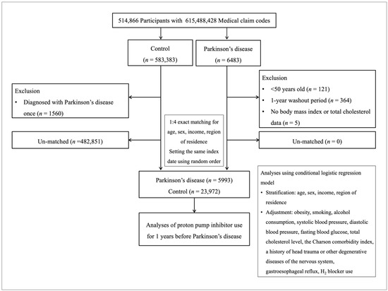 Figure 1. A schematic illustration of the participant selection process that was used in the present study. Of a total of 514,866 participants, 5993 of Parkinson’s disease participants were matched with 23,972 of control participants for age, sex, income, and region of residence.