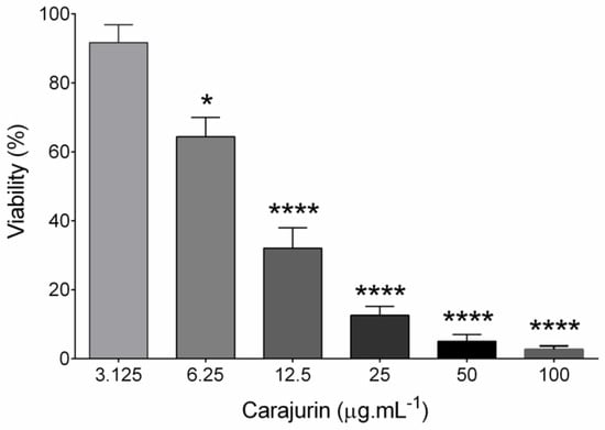 Effects of carajurin on growth of Leishmania amazonensis promastigote forms. Parasites in log-phase (2 × 106 mL−1) were incubated in different concentrations of carajurin. Data represent the mean ± standard error of three independent experiments carried out in triplicate. (*) p < 0.05; (****) p < 0.0001, when compared to untreated parasites by Mann-Whitney test.