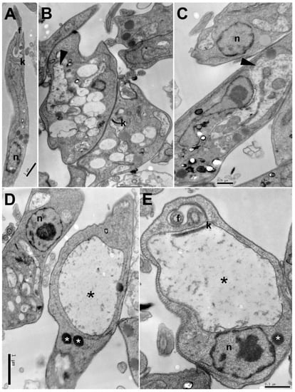Ultrastructural changes in promastigote forms of Leishmania amazonensis treated with carajurin: (A) untreated parasites; (B–E) parasites treated for 24 h with carajurin (IC50). Electron-dense corpuscles (white asterisks), vesicles with electron-dense content (arrowhead), kinetoplast swelling (black asterisks). N = nucleus, f = flagellum, k = kinetoplast.