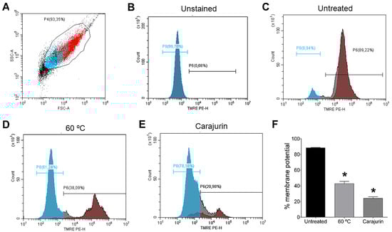 Flow cytometry of Leishmania amazonensis treated with IC50 of carajurin to assess the potential of the mitochondrial membrane (∆Ψm). (A) Promastigotes captured in the gated region and representative histogram. (B) Unstained parasites. (C) Untreated parasites. (D) Promastigote forms of L. amazonensis killed by heat. (E) Histogram representative of promastigotes treated with carajurin. (F) Statistically significant differences were observed between the percentages of cells marked with TMRE in the untreated group and the groups treated with carajurin, at the IC50 concentration (26.4 µM). (*) p < 0.05, when compared with the untreated group by Mann-Whitney test.