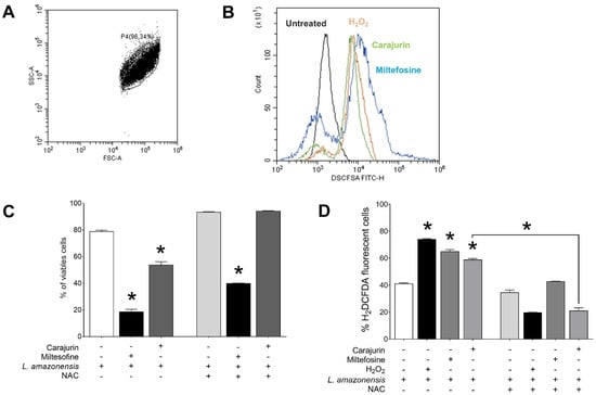 Evaluation of intracellular ROS levels in Leishmania amazonensis promastigotes and effect of N-Acetyl-L-cysteine on carajurin-induced cell death after incubation with carajurin for 24 h. (A) Promastigotes captured in the gated region and representative histogram. (B) The green line shows increased ROS production in parasites treated with carajurin, at the IC50 concentration (26.4 µM), when compared to control parasites (black line). The same was observed in the group treated with H2O2 (orange line) and miltefosine (blue line). (C,D) Promastigotes were cultivated in the presence of N-Acetyl-L-cysteine (NAC, 300 µM) and carajurin (IC50 concentration, 26.4 µM). Miltefosine (50µM) was used as a cell death control, and H2O2 (50 μM) as a natural inducer of ROS. Generation of cell death and ROS was measured using fluorescent dye propidium iodide (PI) and H2DCFDA, respectively. (*) p < 0.05, when compared to untreated parasites by Mann-Whitney test.