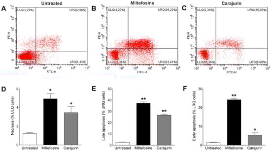 Changes in phosphatidylserine exposure and plasma membrane integrity in Leishmania amazonensis promatigotes treated with IC50 of carajurin for 24 h. Parasites were labeled with Annexin V-FITC and PI. (A) Untreated promastigotes used as control. (B) Parasites treated with miltefosine, an apoptosis-inducing drug, at a concentration of 50 μM. (C) Promastigotes treated with carajurin, at the IC50 concentration (26.4 µM). In (D–F), statistical differences between the percentage of necrotic, late apoptotic, and early apoptotic cells, respectively, are shown. In all, the results obtained in the groups treated with carajurin and miltefosine were statistically different when compared to untreated parasites. (*) p < 0.05; (**) p < 0.01, when compared to untreated parasites by Mann-Whitney test. ULQ: = upper left quadrant; URQ = upper right quadrant; LRQ = low right quadrant.