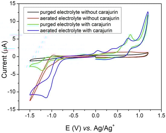 Cyclic voltammograms obtained at glassy carbon electrode in dichloromethane containing 0.05 mol L−1 of TBAPF6 (electrolyte) at scan rate of 50 mV s−1, where the black line shows purged electrolyte (without oxygen) in the absence of carajurin, the red line shows aerated electrolyte (with oxygen) in the absence of carajurin, the green line shows electrolyte with carajurin in the absence of oxygen, and the blue line shows electrolyte with carajurin in the presence of oxygen.