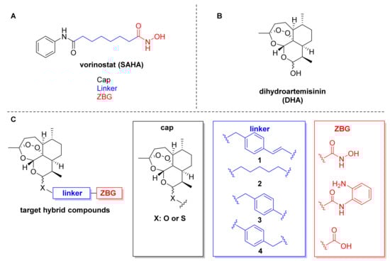 (A) HDACi pharmacophore model illustrated on the FDA-approved drug vorinostat (SAHA). (B) Chemical structure of dihydroartemisinin (DHA). (C) Compound design based on DHA as cap connected by C-10 ether or thioether groups to four different linkers and three zinc-binding groups.