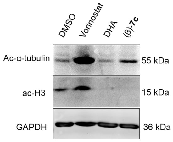 K562 cells were treated with DHA, (β)-7c, and vorinostat (0.4 µM) for 24 h. Subsequently, cell lysates were immunobloted with anti-acetyl-α-tubulin and acetyl-histone H3 antibodies, whereas GAPDH served as a loading control. The experiments were repeated three times (n = 3), and a representative blot is shown here.