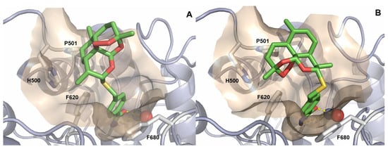 Despite their different configuration at C-10 thiolactol group, (α)-7c and (β)-7c demonstrated almost identical inhibitory activity towards HDAC6. To shed light into this phenomenon, we docked (α)-7c and (β)-7c into the second catalytic domain of HDAC6 (PDB: 5EDU [29]). The experimental details are summarized in the Supplementary Materials. In the case of both compounds, the zinc-binding occurs in a monodentate manner, binding the zinc ion through the hydroxamate moiety and the Zn2+-bound water molecule via the carbonyl oxygen (see Figure 3). The benzylic linkers are sandwiched between two phenylalanine (F620 and F680) residues, thereby stabilizing the conformations via π-π stacking. Despite their different stereochemistry at the thiolactol connecting unit, both cap groups of (α)-7c and (β)-7c are oriented into the L1-loop formed by the amino acids H500 and P501 [29]. The main interactions of the cap are most likely of hydrophobic origin. In our docking models, the diasteromers (α)-7c and (β)-7c display nearly the same interactions with the HDAC6 enzyme, which further support our determined inhibitory activities against this HDAC isoform.