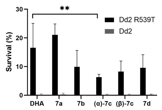 Survival of the artemisinin-resistant (Dd2 R539T) and sensitive (Dd2) P. falciparum line after treatment with 700 nM of the respective compound (DHA or DHA–HDACi hybrid) in the ring-stage survival assay. Results show the survival in percent of the drug-treated parasites in relation to the untreated control (DMSO) parasites. Each experiment was performed twice in duplicate. All compounds, except 7a, were slightly more active, with (α)-7c being significantly more active than DHA alone (unpaired t-test: ** p < 0.005).