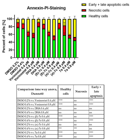 To further investigate the efficacy of the DHA–HDACi hybrids for their ability to induce apoptosis, we performed annexin V-PI measurements after treating K562 cells with the respective compound for 48 h using DHA and the reference HDACi vorinostat as controls (Figure 5). In line with the cell viability data, the exposure of K562 cells to the DHA–HDACi hybrids 7a and (β)-7c significantly induced apoptosis as compared to DHA. Notably, apoptosis induction was comparable to the FDA-approved HDACi vorinostat, whereas only (α)-7c incubation induced significant necrosis. Taken together, the obtained data strongly suggest that the DHA–HDACi hybrids exhibit superior antileukemia activity to DHA and are even comparable with the known reference panHDACi vorinostat. Finally, to investigate the selectivity of the three most promising hybrids for leukemia cells over noncancer cells, we screened 7a, α-7c, and β-7c for their cytotoxicity against two healthy individually-derived fibroblasts. The results are presented in Table 4. Importantly, all hybrids demonstrated clearly reduced cytotoxicity against fibroblasts compared to leukemia cells (Table 4), thereby leading to high selectivity indices (SI) of up to 87 in the case of 7a (see Table S3, Supplementary Materials).