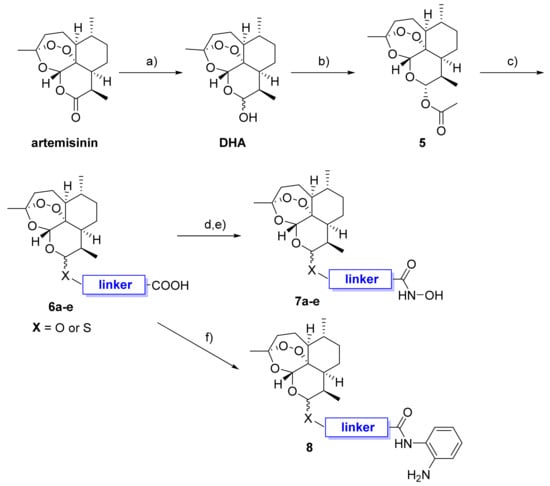 The desired DHA–HDACi hybrids were synthesized as summarized in Scheme 1. In the first step, DHA was prepared by a reduction of commercially available artemisinin. The subsequent treatment of DHA with acetic anhydride provided the key intermediate dihydroartemisinin acetate (5). Following the procedure of Gour et al. [27], 5 and the respective thiol or alcohol were subjected to a BF3-catalyzed reaction to generate the intermediates 6a–e. The hydroxamate-based target compounds were obtained in a two-step protocol. First, an amide coupling of 6a–e with O-(tetrahydro-2H-pyran-2-yl)hydroxylamine using EDC/DMAP as coupling agent afforded the THP-protected hydroxamic acids. Cleavage of the THP protection group was achieved by using catalytic amounts of benzoyl chloride in ethanol to provide the target compounds 7a–e. The o-aminoanilide 8 was prepared from 6a and o-phenylenediamine by another EDC/DMAP-mediated amide coupling reaction. Compounds 6a, 7a, 7b, 7d, and 8 were obtained as mixture of C-10 α- and β-isomers, whereas 7c and 7e were separated by preparative HPLC into the α-thiolactols ((α)-7c and (α)-7e) and the β-thiolactols ((β)-7c and (β)-7e).