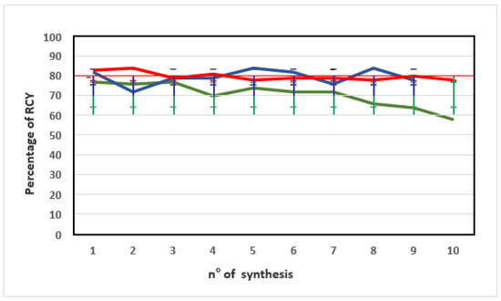 Trend of the percentage of RCY obtained from [68Ga]Ga-PSMA-11 radiosyntheses performed using a PSMA-11 precursor solution from methods A (green line), B (blue line), and C (red line). The error bars show standard deviations (SD).