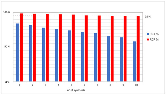 Comparison between % RCY (blue bars) and % RCP (red bars) data from [68Ga]Ga-PSMA-11 preparations: a decrease of % RCY corresponds to a decrease in % RCP close to the lower limit of the pharmacopeia specifications. The dotted line represents this minimum acceptable value of % RPC (95%).