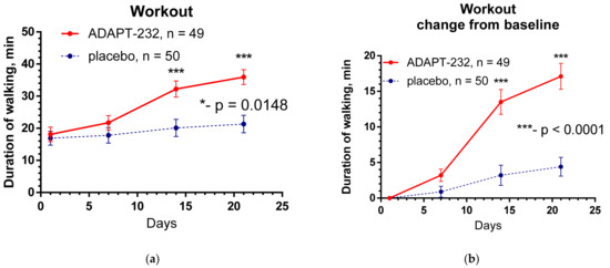 - Physical activity and daily workout: assessed by Habitual Physical Activity Questionnaire Score and duration of walking (min). Time frame: change from baseline during the treatment period and follow-up (from Day 1 to Day 14 and day 21 after randomization).