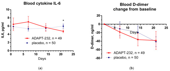 - Hypercoagulation marker: D-dimer, concentration in the serum, pg/L. Time frame: change from baseline during the period of the treatment and follow-up (from Day 1 to Day 14 and Day 21 after randomization).