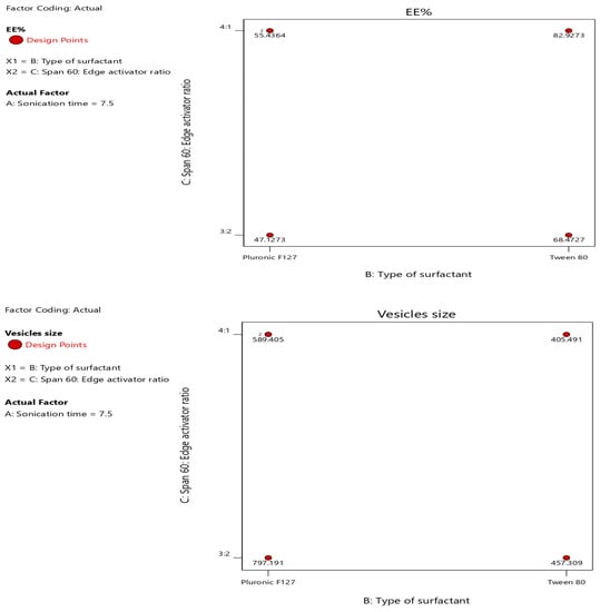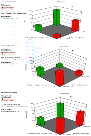 where A is the sonication time, B is the type of surfactant, and C is span 60:EA ratio. The positive and negative sign in the equation indicated the favorable and unfavorable nature of independent variables over the response [24]. It is clear from the regression Equation (1) that the sonication time had a negative impact on EE%, while the type of surfactant, and span 60:EA ratio had positive effects on EE%.