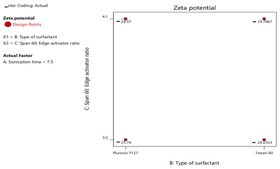 It was clear that the sonication time had a negative impact on the zeta potential values although it showed an interactive effect with both the surfactant type and span 60:EA ratio. As shown in Equation (3), sonication time and the type of surfactant collectively showed a negative impact on the zeta potential which may be attributed to the main effect of sonication time. Similarly, although sonication time and span 60:EA ratio showed a negative effect separately, they collectively showed a positive effect on the zeta potential values.