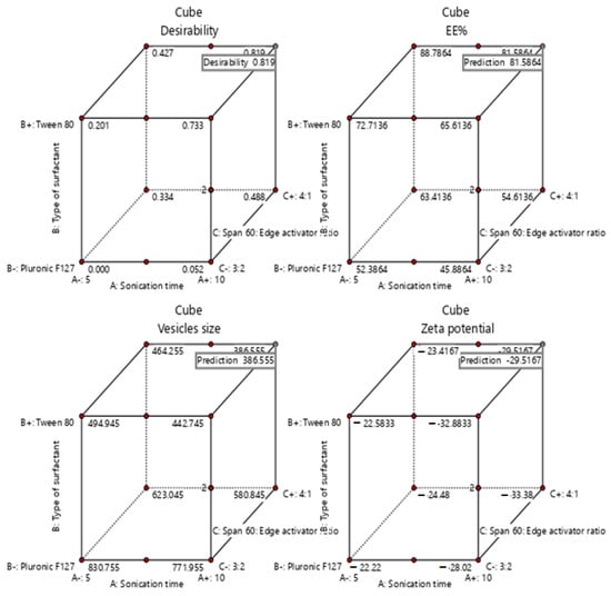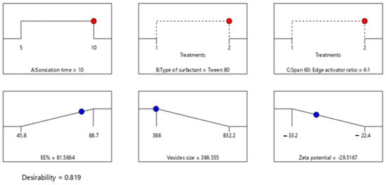 Design-Expert® software was applied to select the best formula by utilizing the desirability function [47]. The software selected the optimized formula based on maximizing EE% and zeta potential while minimizing the vesicles’ size. Additionally, to validate the optimized formula, the experimental values of EE%, vesicle size, and zeta potential were compared with the predicted values and the % relative error was calculated using the following formula [20].