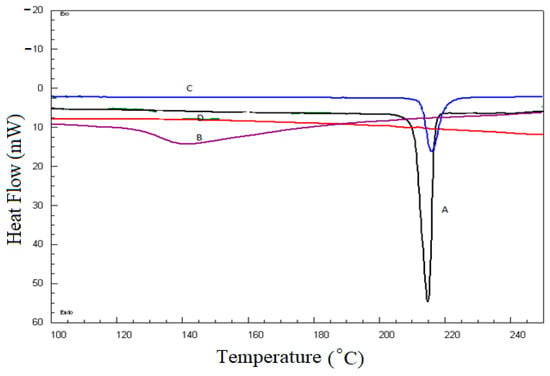 DSC thermal analysis was performed to identify the possible interaction between pure BGT and excipients. A comparative DSC spectrum is presented in Figure 5. The crystallinity of the pure drug BGT was confirmed by a sharp endotherm at 215 °C (Figure 5 (A)), which was an agreement with previously reported studies [14]. The DSC thermogram of Span-60, Tween® 80, and the chitosan physical mixture (Figure 5 (B)) showed an endothermic peak at 142 °C due to the melting transition of chitosan [41]. The DSC thermogram of Span-60, Tween® 80, Chitosan, and the BGT physical mixture showed a sharp endothermic peak of BGT with reduced intensity at 215 °C (Figure 5 (C)), indicating no chemical interaction between the BGT’s and NSPs’ ingredients. Additionally, the optimized formulation (Figure 5 (D)) showed complete disappearance of the endothermic peak of BGT, confirming complete drug encapsulation within NSPs vesicles.