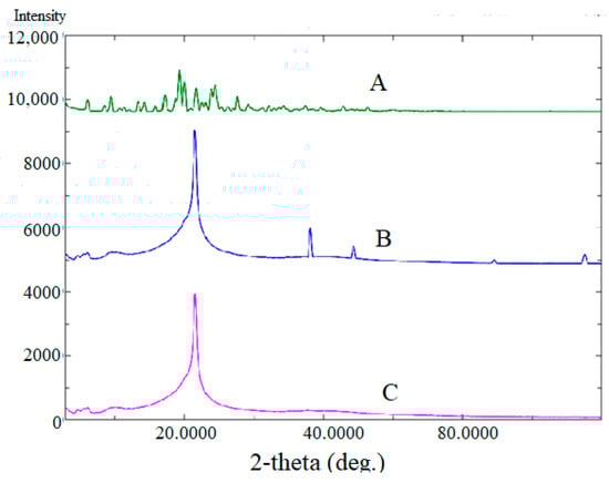 Comparative XRD of spectra of pure BGT (A); Span-60, Tween® 80, and chitosan physical mixture (B); and chitosan-coated BGT-loaded NSPs (C).