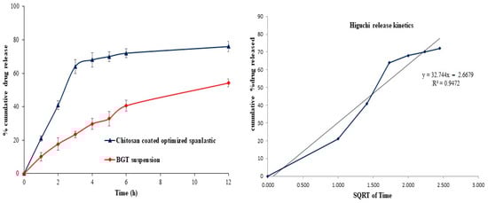 The in vitro release profile of BGT from the chitosan-coated BGT-loaded NSPs compared to pure BGT suspension are presented in Figure 7. As shown in Figure 7, 64 ± 1.8% drug was released in the first three hours of the study followed by sustained release, this initial rapid release of drug from chitosan-coated BGT-loaded NSPs was due to the surface adsorbed drug on chitosan polymer. The chitosan-coated BGT-loaded NSPs exhibited enhancement in cumulative release of BGT (79.3 ± 2.4%) as compared to pure BGT suspension (54.2 ± 3.2%) in 12 h of the study. The release was found to be statistically difference (p < 0.01) from chitosan-coated BGT-loaded NSPs as compared to pure BGT suspension. The release data of chitosan-coated optimized NSPs were fitted with different kinetic models and the coefficient of correlation (R2) and slope are presented in Table 3. It was considered that the Higuchi model (Figure 7) acted as a best fit model, signifying sustained release of drug release from the chitosan polymer by diffusion control [43].