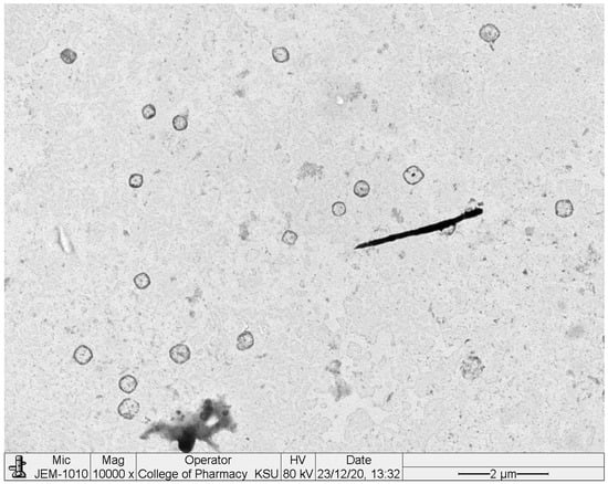 The morphology and approximate vesicle size of optimized BGT-loaded NSPs were studied by TEM analysis (TEM; JEOL JEM-1010, Tokyo, Japan) [51]. The optimized BGT-loaded NSPs were diluted with Milli-Q water and vortexed for three minutes. A drop of suspended vesicles was put on parafilm, and the slide of the TEM grid was put on the drop and left for 10 min, The TEM grid with the slide was dried for 40 min using tissue paper, then scanned for vesicle imaging.