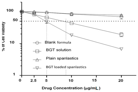 Loading of BGT in chitosan-coated NSPs significantly improved the anticancer activity against H-1975 cell lines. The WST 1 assay exhibited a concentration-dependent reduction in percent cell viability by optimized BGT-loaded SPs (S13) in comparison to free BGT solution against H-1975 cell lines (Figure 9). The optimized BGT-loaded NSPs exhibited a significant reduction in cell viability (69.25, 38.51, 16.16 and 6.81% at 2.5, 5, 10 and 20 µg/mL) in comparison to free BGT (80.10, 69.45, 43.99 and 24.14% at 2.5, 5, 10 and 20 µg/mL) and blank NSPs (99.29, 89.98, 79.59 and 61.49% at 2.5, 5, 10 and 20 µg/mL), respectively. The anti-cancer effect of optimized BGT-loaded SPs (S13) was enhanced by 4.0-fold in comparison to free drug (BGT) at concentration 20 µg/mL against H-1975 cell lines. The reduction in cell viability by chitosan-coated BGT-loaded NSPs compared to BGT solution has been previously reported [13,14]. The enhanced cellular uptake of NSPs might be responsible for a decrease in cell viability [44].