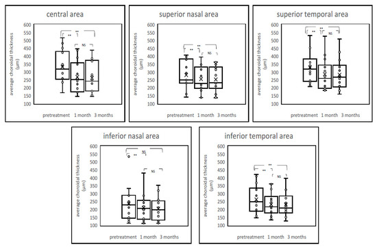 Boxplot graphs of average choroidal thickness before and after treatment. The post-treatment average choroidal thickness showed a significant reduction from baseline at all time points after the PDT, including both the irradiated central area and nonirradiated peripheral areas. NS = not significant, ** p < 0.01.