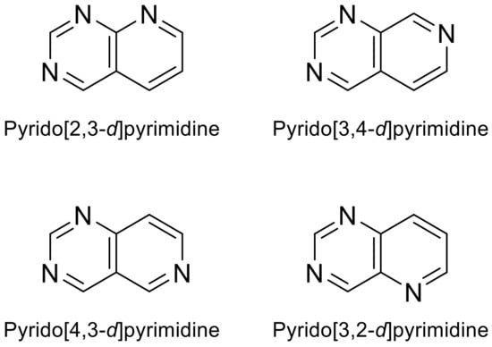 Depending on where the nitrogen atom is located in pyridine, we can find four possible skeletons for the heterocyclic combination of pyrimidine and pyridine rings (Figure 1). Pyridopyrimidines and other N-heterocycles are of great interest due to their biological potential. The pyridopyrimidine moiety is present in relevant drugs and, in recent years, it has been studied in the development of new therapies, as evidenced by numerous publications, studies and clinical trials [,,].
