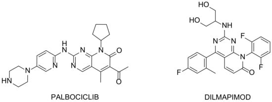 The various pyridopyrimidines are used on several therapeutic targets. We consider all the synthetic protocols to prepare these pyridopyrimidine derivatives which have shown a therapeutic interest or have been approved for use as therapeutics according to bibliographic research conducted on Reaxys and Scifinder. Among them, we can mention in Figure 2 palbociclib and dilmapimod.