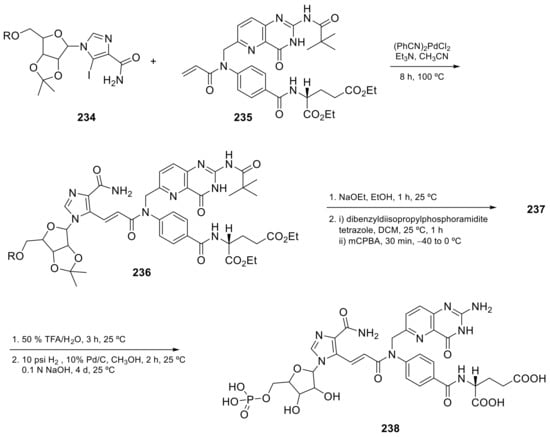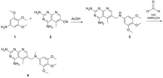 Kisliuk et al. described, in 1993, the synthesis of pyrido[2,3-d]pyrimidine-2,4-diamine (4). The reductive condensation of 6-cyano-5-methyl-pyrido[2,3-d]pyrimidine-2,4-diamine (2) with 3,4,5-trimethoxyaniline (1) in the presence of Raney Ni 70% in acetic acid gave the precursor 3 which underwent methylation at the N10 position by reductive alkylation with formaldehyde and sodium cyanoborohydride (Scheme 1) [].