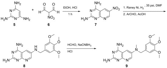 Kisliuk et al. also developed another strategy to synthesize pyrido[2,3-d] pyrimidine-2,4-diamines as compound 9 (Scheme 2, Table 1, entry 2). Starting from 2,4,6-triaminopyrimidine (5) with the sodium salt of nitromalonaldehyde, they obtained in a single step the 2,4-diamino-6-nitropyrido [2,3-d]pyrimidine (7) which was then reduced to its corresponding 6-amino analogue using Raney Ni in DMF. The reductive amination with various aldehydes (ArCHO, in this case 3,4,5-trimethoxybenzaldehyde) provided the desired product 8. In the last step, 8 was N-methylated by treatment with formaldehyde in the presence of sodium cyanoborohydride [] (Scheme 2). An analog compound (Table 1, entry 3) was obtained following the same synthetic pathway (Scheme 2) using 3,5-dimethoxybenzaldehyde.