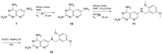 Synthesis of N6-[(2,5-dimethoxyphenyl)methyl]-N6-methylpyrido[2,3-d]pyrimidine-2,4,6-triamine (12) by Queener et al. [].