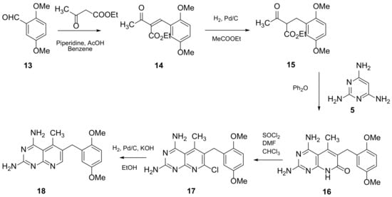The reaction of 2,5-dimethoxybenzaldehyde (13) with ethyl acetoacetate in refluxing benzene in the presence of a mixture of piperidine and glacial acetic acid led to ethyl α-acetyl-β-(2,5-dimethoxyphenyl)acrylate (14). The latter is then hydrogenated using 5% Pd/C as a catalyst to yield the desired ethyl α-acetyl-(2,5-dimethoxyphenyl)propionate (15). Then, 15 was condensed with 2,4.6-triaminopyrimidine in a diphenyl ether at 195–230 °C. The 2,4-diamino-7,8-dihydro-6-(2,5-dimethoxybenzyl)-5-methyl-7-oxopyrido[2,3-d]pyrimidine (16) obtained was treated with a 1:1 complex of N,N-dimethylformamide thionyl chloride to give the expected 7-chloro-6-[(2,5-dimethoxyphenyl)methyl]-5-methylpyrido[2,3-d]pyrimidine-2,4-diamine (17). The desired PTX 18 was obtained by the hydrogenolyzation of 17 using Pd/C in the presence of potassium hydroxide (Scheme 4) [].