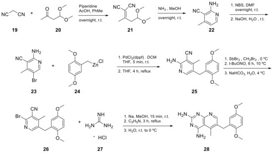 Chan and Rosowsky reported the synthesis of PTX using the condensation of 4,4-dimethoxy-2-butanone with malononitrile to obtain the ylidenemalononitrile 21 which was cyclized into 2-amino-4-methyl-3-carbonitrilepyridine (22) using ammonia in methanol. The halogenation of 22 with N-bromosuccinimide in DMF gave the 5-bromo derivative 23. The reaction of 23 in dry THF with 2,5-dimethoxybenzyl- zinc chloride and CH2Cl2 [PdCl2(dppf).CH2Cl2] provided 2-amino-5-(2,5-dimethoxybenzyl)-4-methyl-3-carbonitrilepyridine (25). Subsequently, the nonaqueous diazotization of 25 with t-BuONO and SbBr3 in CH2Br2 gave the bromo nitrile intermediate 26, which was successfully reacted with guanidine to afford 6-[(2,5-dimethoxyphenyl)methyl]-5-methylpyrido[2,3-d]pyrimidine-2-amine (28) (Scheme 5) [].