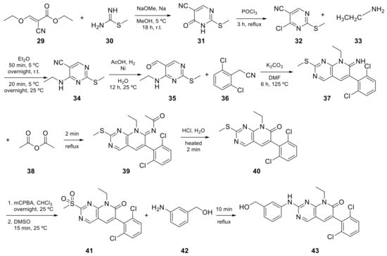 A.M. Doherty et al. [] previously reported the identification of a lead, 2-amino-6-(2,6-dichlorophenyl)-8-methyl-8H-pyrido[2,3-d]pyrimidin-7-one, as a good inhibitor of PDGFr (platelet-derived growth factor) or FGFr (fibroblast growth factor) tyrosine kinase []. Tyrosine kinases are enzymes that catalyze a specific phosphorylation of tyrosine residues on proteins. These enzymes are implicated in diverse mechanisms in cell life. Finding selective inhibitors of such enzymes may make it possible to fight against angiogenesis, restenosis atherosclerosesis and tumor growth. A library of compounds was synthesized and tested. The synthetic pathway used to obtain these interesting core structures was applied to the 6-(2,6-dichlorophenyl)-2-{[3-(hydroxymethyl)phenyl]amino}-8-ethyl-7H,8H-pyrido[2,3-d]pyrimidin-7-one (43) and is depicted in Scheme 6 (Table 1, entry 6). Biological tests carried out on the library of compounds obtained showed that the activity of derivatives bearing an ethyl group on N8 was four-fold better than for N8-methylated analogues.