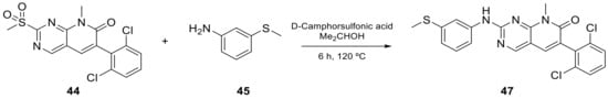 PD-173955 (6-(2,6-dichlorophenyl)-8-methyl-2-([3-(methylsulfanyl)phenyl]amino)-7H,8H-pyrido [2,3-d]pyrimidin-7-one (47) (Scheme 7, Table 1, entry 7) is another example of this family of pyrido[2,3-d]pyrimidines. It is known to target the ephrin receptor (EPH) family of proteins that are overexpressed in some cancers []. This compound, 47, was easily obtained from previously synthesized starting material by a reaction with 3-methylthio-aniline in the presence of camphorsulfonic acid in isopropylalcohol.
