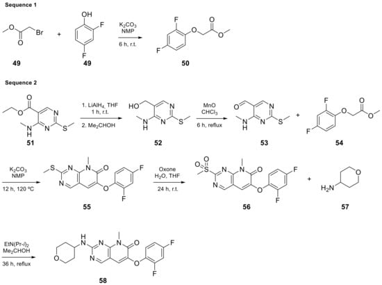 The synthesis of kinase inhibitors such as 6-(2,4-difluorophenoxy)-8-methyl-2-[(oxan-4-yl)amino]-7H,8H-pyrido[2,3-d]pyrimidin-7-one (58) (Scheme 8, Table 1, entry 8) was performed via the following 6 step synthetic pathway using substituted 2,4-difluorophenol obtained beforehand, according to sequence 1 [].