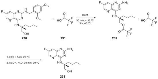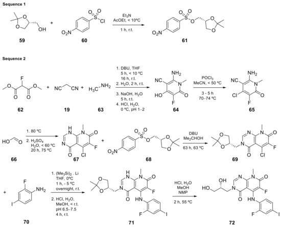 Li et al. [] reported the development of an efficient approach to achieve TAK-733 using fewer steps and with higher yields. A polysubstituted fluoropyridone 64 was produced in one pot via a three-step cascade reaction: condensation between α-fluoromalonate and malononitrile, methyl amide formation, and intramolecular cyclization. Hydroxyl functionality chlorination and cyclization with formic acid afforded the pyridopyrimidone 67. Ensuing N-alkylation with the nosylate of (R)-glycerol acetonide and chlorine displacement with 2-fluoro-4-iodoaniline was successfully achieved. The final step consisted of the acid-catalyzed deprotection of the acetonide functionality to afford the pyrido[2,3-d]pyrimidine-4,7-dione 72 (Scheme 9) [].