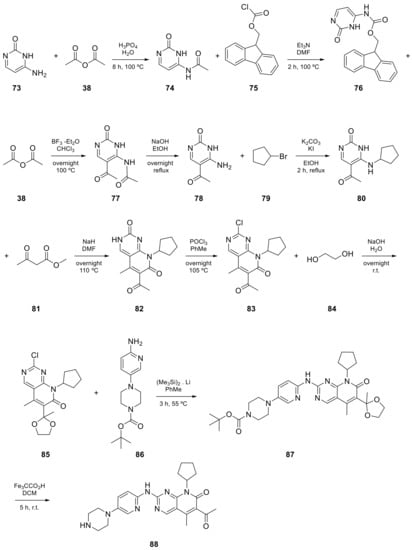 Palbociclib (88 in Scheme 10, Table 1, entry 10) is a breast cancer drug developed by Pfizer. This is a piperazine pyridopyrimidine that plays a role in the cell cycle mechanism. Pyridopyrimidine referenced as a second-generation cyclin-dependent kinase inhibitor. It can be used as an endocrine-based chemotherapy drug in combination with other anti-tumor drugs to treat HER2-negative and HR-positive advanced or metastatic breast cancer.
