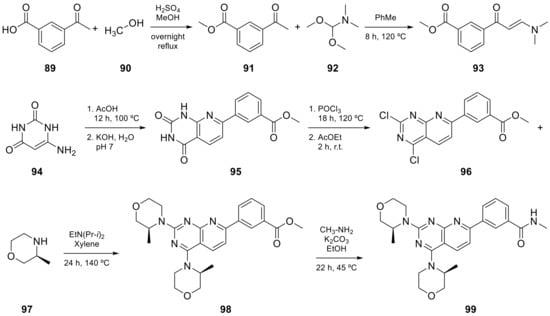 Vistusertib (99 in Scheme 11, Table 1, entry 11) is being studied for the treatment of advanced gastric adenocarcinoma []. Vistusertib or AZD2014 is a novel mTOR inhibitor. Meng et al. [] reported a synthesis of Vistusertib in 2019 from the 3-acetylbenzoic acid, which was transformed to methyl ester 91, and then treated with dimethylformamide dimethylacetal to furnish the enaminone 93. The enaminone heteroannulation reaction with 6-aminouracil was accomplished in acidic conditions to allow pyrido[2,3-d]pyrimidine 95. This compound was chlorinated with phosphorus oxychloride to obtain 2,4-dichloropyrido[2,3-d]pyrimidine 96. In the next stage, this team showed an improvement when they realized that xylene was the ideal solvent for the substitution reaction. In this way, Vistusertib was synthesized in one step. When potassium carbonate was used as the reaction accelerator, the intermediate was subjected to aminolysis in a 30% methylamine alcohol solution to obtain the final product 99 [].