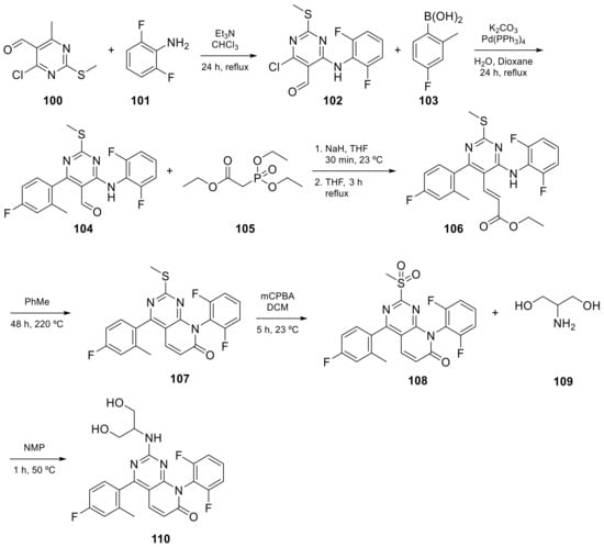 Synthesis of 8-(2,6-difluorophenyl)-2-[(1,3-dihydroxypropan-2-yl)amino]-4-(4-fluoro-2-methylphenyl)-7H,8H-pyrido[2,3-d]pyrimidin-7-one, Dilmapimod (110) [].