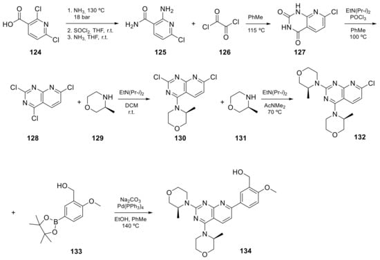 AZD8055 (134 in Scheme 14, Table 1, entry 14) has been used in treatment trials of cancer, lymphoma, solid tumors, malignant glioma and brainstem glioma []. AZD8055 is a selective ATP-competitive mTOR kinase inhibitor and inhibits cell proliferation and Pass et al. described its synthesis. 3S-Methylmorpholine was added successively at the C4 and then C2 positions of the trichloro intermediate 128 to give the chlorinated pyrido[2,3-d]pyrimidine 132 which was then reacted with a boronic ester using palladium coupling to achieve the final compound [].
