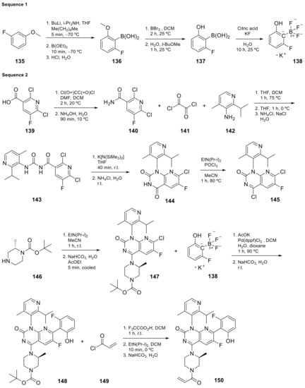 In 2020, Parsons et al. [] patented their improvements in the synthesis of key intermediates of the AMG-510 KRAS G12C inhibitor, as described in Scheme 15. The synthesis is carried out in fifteen steps, one of the reagents having to be obtained beforehand according to sequence 1.