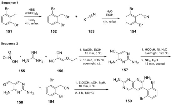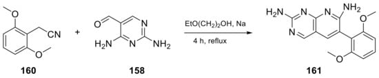 Zega et al. reported in 2012 the synthesis of 6-(2,6-dibromophenyl)pyrido[2,3-d]pyrimidine-2,7-diamine (159) (Scheme 16, Table 1, entry 16) which has biotin carboxylase as a biological target. They obtained 2,4-diamino-5-cyanopyrimidine 157 by condensation of guanidine nitrate with ethoxymethylenemalononitrile (156) in ethanol and sodium ethoxide, to achieve the free guanidine base. A Raney nickel catalyst in 98% formic acid as a solvent allowed the reduction of the cyano group. Then 2,4-diaminopyrimidine-5-carboxaldehyde 158 was condensed with benzylnitrile under basic conditions to yield 2,7-diaminopyridopyrimidine 159 (Scheme 16) [].