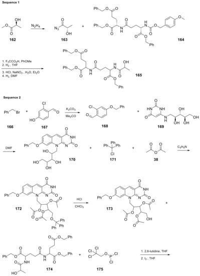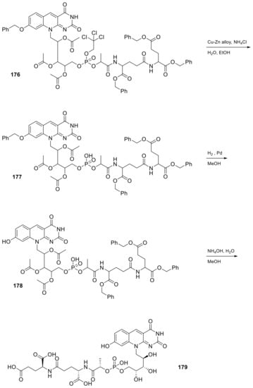 Yoneda et al. reported in 1990 the first total synthesis of the coenzyme factor 420, the (2S)-2-[(4S)-4-carboxy-4-[(2S)-2-([hydroxy(([(2R,3S,4S)-2,3,4-trihydroxy-5-(8-hydroxy-2,4-dioxo-2H,3H,4H,10H-pyrimido[4,5-b]quinolin-1-yl)pentyl]oxy))phosphoryl]oxy)propanamido]butanamido]pentanedioic acid (179 in Scheme 18, Table 1, entry 18). This team’s approach consisted of using two routes without the need to protect functional groups. The desired product was attained by the creation of a phosphotriester bond concerning a protected 8-hydroxy-10-o-ribityl-5-deazaisoalloxazine moiety and a peptide moiety, (l-lactoyl-y-l-glutamyl)-l-glutamic acid tribenzyl ester, by the phosphite triester method using 2,2,2-trichloroethyl phosphorodichloridite, followed by consecutive deprotection methods (Scheme 18) [].