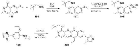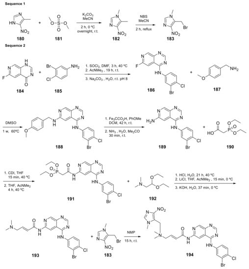Carlin et al. [] patented in 2015 the preparation of 4-anilinopyrido[3,4-d]pyrimidine prodrugs (Scheme 19, Table 1, entry 19) as kinase inhibitors useful for cancer treatment. The procedure is described in Scheme 19 with classical synthetic methodologies affording the expected compound 194 in twelve steps.