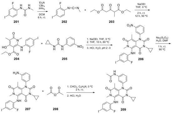 Synthesis of N-(3-(3-cyclopropyl-5-[(2-fluoro-4-iodophenyl)amino]-6,8-dimethyl-2,4,7-trioxo-1H,2H,3H,4H,6H,7H-pyrido[4,3-d]pyrimidin-1-yl)phenyl)acetamid, Trametinib (209) [].