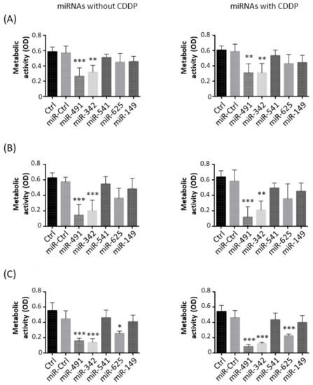 p < 0.001) relative to miR-Ctrl/CDDP-treated cells. However, miR-491-5p and miR-342-5p had a more potent effect. MiR-491-5p downregulated the metabolic activity by 2.8-fold (