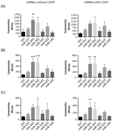 Figure 2A). In combination with CDDP, miR-491-5p and miR-342-5p did not significantly induce further cytotoxicity (1.9-fold increase and 2-fold increase, respectively). MiR-625-5p tended to increase cytotoxicity (1.3-fold increase relative to miR-Ctrl and 1.6-fold increase relative to miR-Ctrl/CDDP-treated cells).